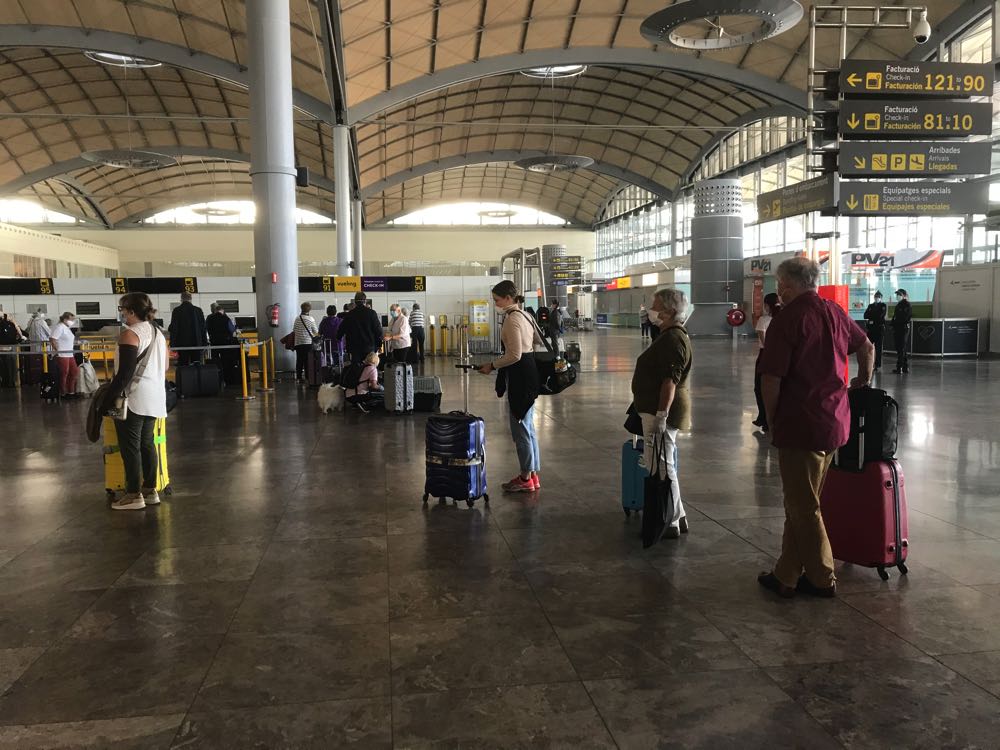 Turvavälimerkintöjä kenttähallin lattiassa, maskipakko sekä kentällä että lentokoneessa ja check-in -henkilöstö turvalasien takana. Nämä ovat esimerkkejä Alicante-Elchen lentoaseman uusista turvakäytännöistä.