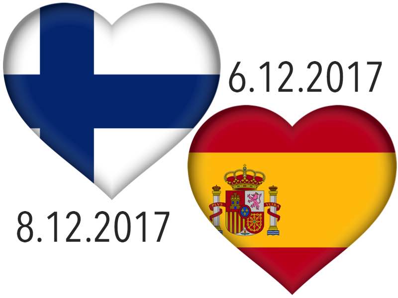 Paitsi Suomen 100-vuotisjuhla on huominen keskiviikko 6.12 kansallinen juhlapäivä myös Espanjassa. Espanjassa juhlitaan perustuslakia (Día de la Constitución), nykyinen perustuslaki astui voimaan vuonna 1978 diktaattori Francisco Francon kuoltua muutamaa vuotta aiemmin. Perjantaina 8.12 vietetään kirkollista juhlapyhää, neitseellisen sikiämisen päivää (Inmaculada Concepción).