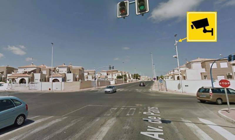 Kuvassa kameravalvottu risteys Torreviejassa. Kuva Google Maps, muokkaus Torrevieja.fi
