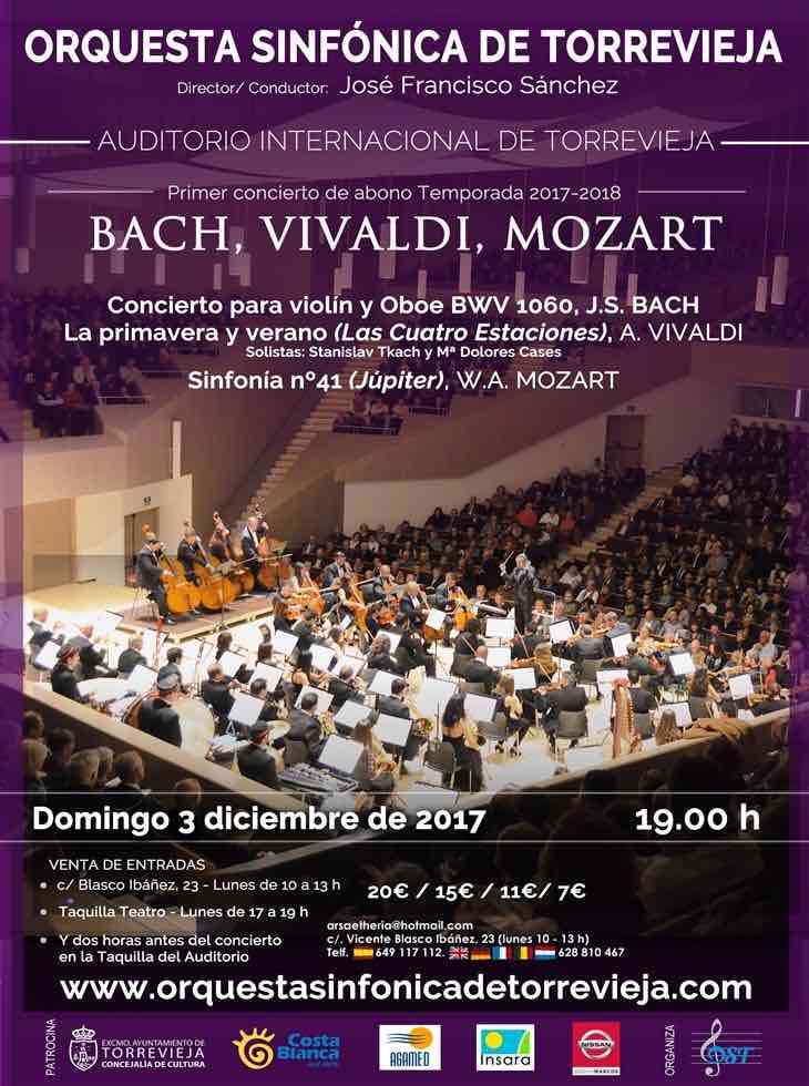 Torreviejan sinfoniaorkesteri avaa kauden 2017-2018 konsertilla 3.12. Konsertissa kuullaan Bachin, Vivaldin ja Mozartin musiikkia.