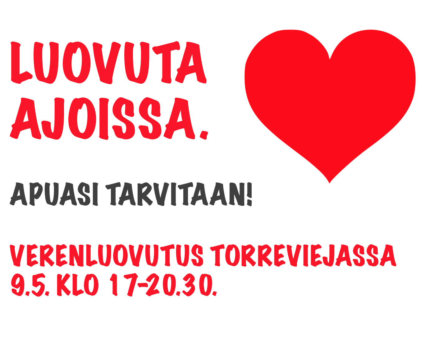 Paras menovinkki tällä viikolla, teet samalla hyvää muille. Käykää luovuttamassa verta, paikkana on Torreviejan nuorisotoimen (Centro de Información y Animación Juvenil CIAJ) toimisto "rantakadulla", siinä Burger King -ravintolan vieressä, os. Paseo Juan Aparicio. Paikalla on luonnollisesti terveydenhuollon ammattilaisia asiaa hoitamassa. Verenluovutus alkaa klo 17 ja päättyy klo 20.30.